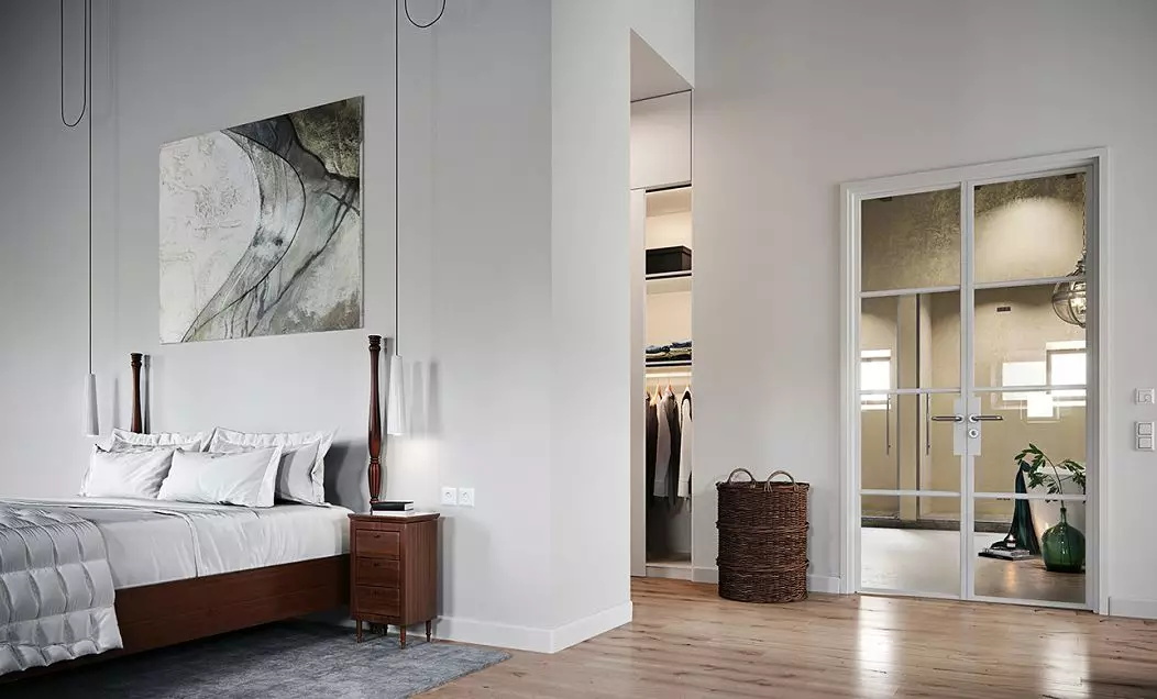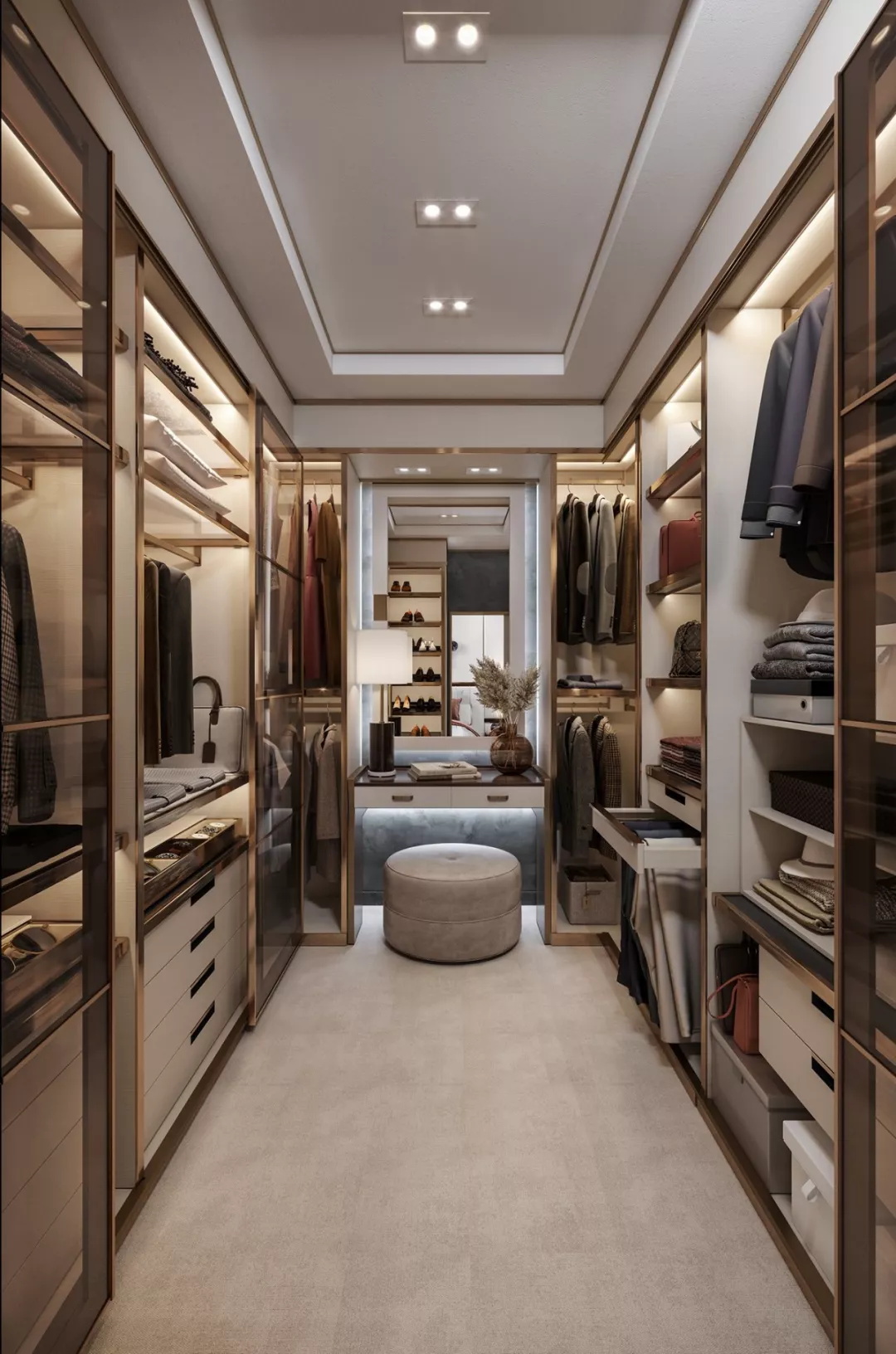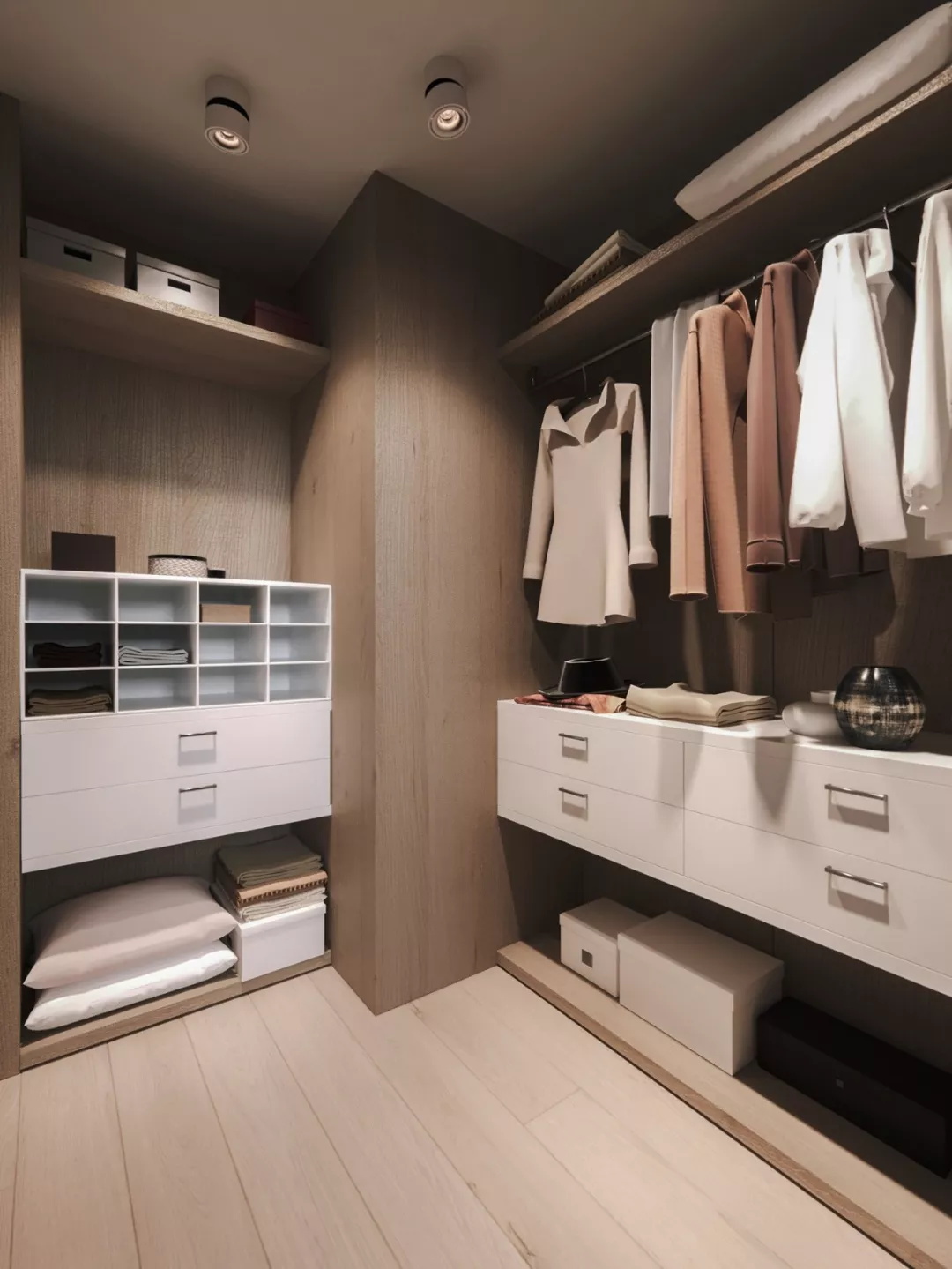 無法設置獨立的衣帽間,這個時候可以利用轉角這個被大家認為空間死角的位置,利用兩處相連的墻面,用衣柜拼接設計,讓轉角區域成為一個衣帽間,不僅節省了空間,也很美觀。
